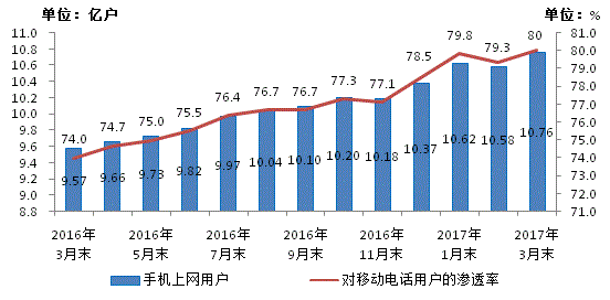 2016-2017年3月手機上網(wǎng)用戶和對移動電話用戶滲透率情況